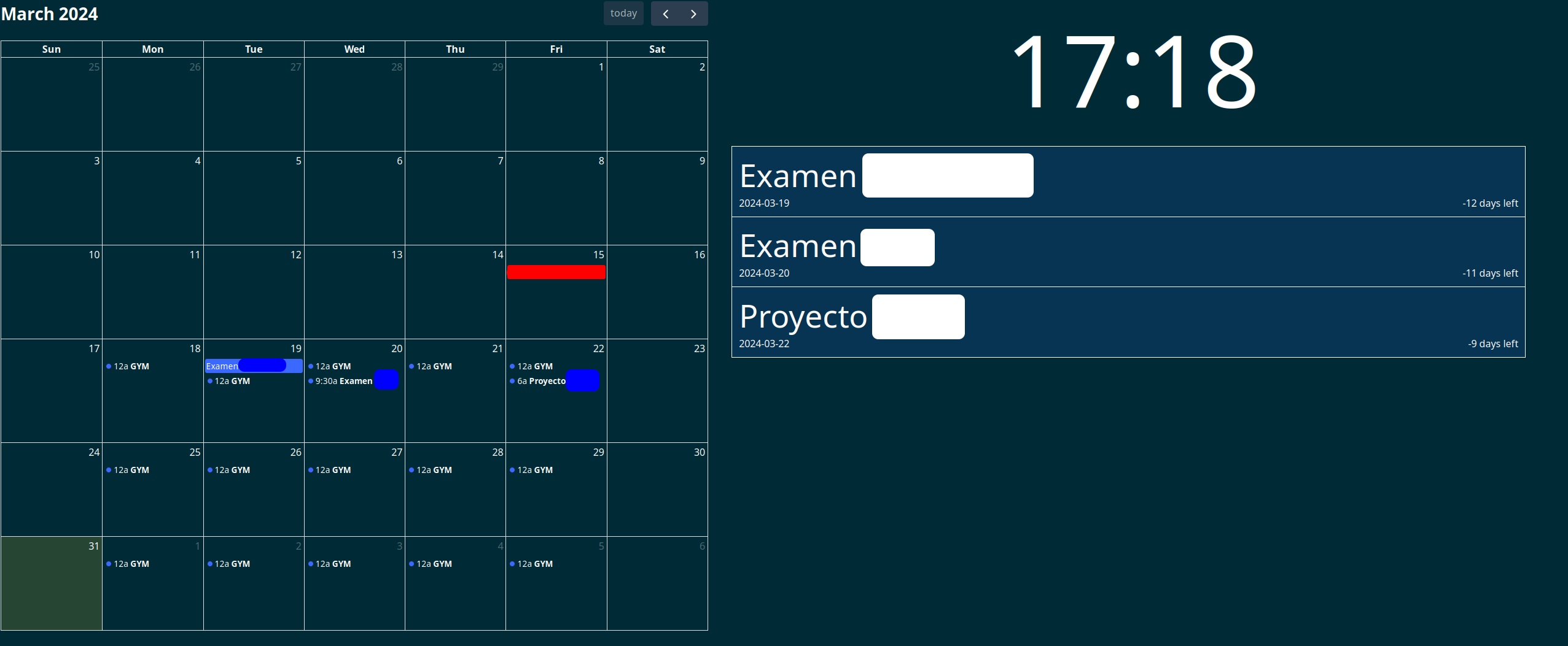 Para obtener los datos aproveche que uso obsidian y que uso syncthing, obsidian con el plugin de fullcalendar puedo crear eventos en el calendario desde mi celular y como se sincronizan automaticamente con mi servidor de syncthing que usa mi raspberry Pi que uso como servidor, puedo obtener cualquier nuevo evento que agregue, luego con un servidor de python hice un programa que lea todos los pendientes, y convierte en yaml en json de tal forma que los pueda representar en mi despertador.