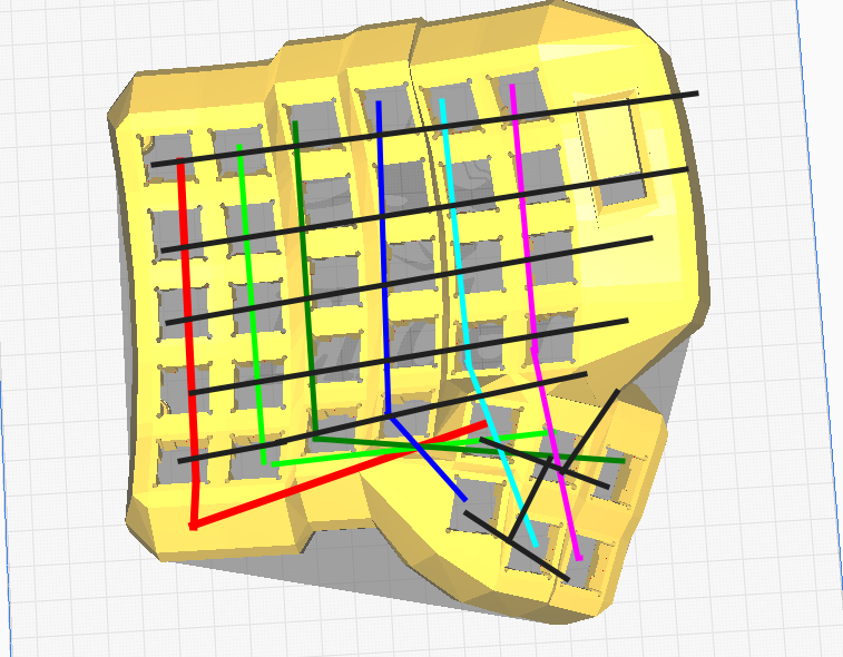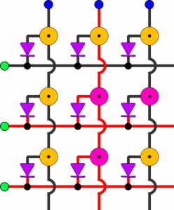 Teniendo un total de 6 columans con 6 filas, los diodos los coloque con el anodo saliendo del switch y el catodo conectado a su columna correspondiente, osea de la siguiente forma: