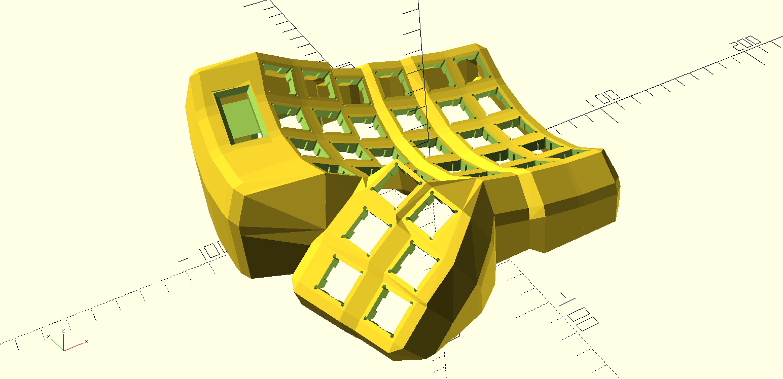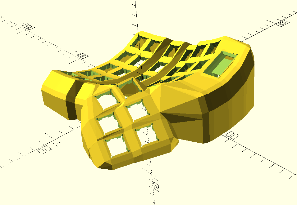 Entonces mejor decidi hacer una nueva version de el teclado, y para esto lo primero que cambie fue el modelo 3D, este modelo tambien consisten en dos teclados separados, pero me intereso la idea de aprovechar la impresion 3D para darles un relieve, primero quise usar este fork de el modelo original del teclado dactyl manuform, pues este repositorio tiene una forma estandar de crear estos teclados y es muy facil de hacer modificaciones, pero al ver los forks de este fork me encontre con este otro fork que no solo parece que incluye mejoras en la generacion de la geometria, pues ha diferencia del primero este usa python para generar los modelos 3D, otra de las caracteristicas por la cual lo escoji es por que por defecto tiene la opcion de generar los modelos con un espacio para una pantalla oled de 128x32 con varios metodos para colocar esta en su lugar, por lo que esto me ahorraria este trabajo de modificar el diseño, y finalmente este tiene la opcion de generar los modelos con un espacio abierto para colocar cualquier adaptador que quepa en ese lugar, dando flexibilidad sobre que microcontrollador se puede usar.
