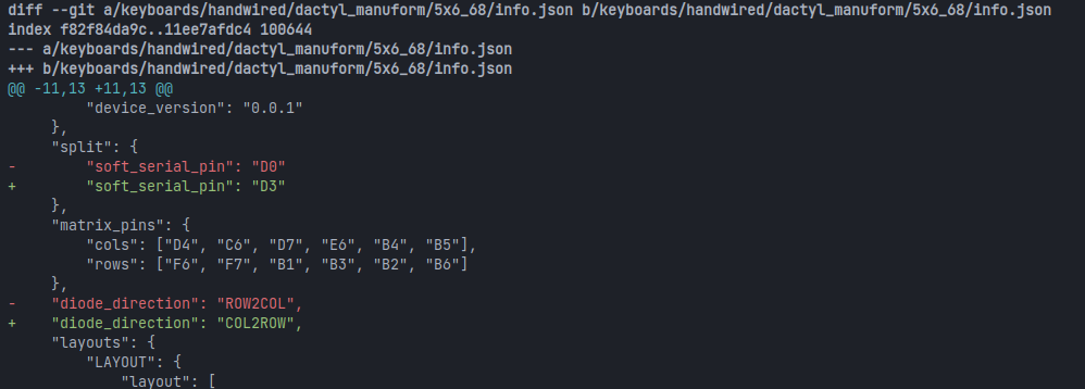 Hay que modificar estos archivos directamente para poder cambiar el funcionamiento del teclado, el primero cambio que hice fue cambiar el pin de comunicacion y la orientacion de los diodos, esto se hace en archivo info.json, el cambio del pin de la comunicacion fue por que para las pantallas se utiliza el protocolo I2C y para este protocolo se necesitan dos pines, que serian el 2 y 3 en digital pero los pines D1 Y D0 si se utiliza el nombre de los pines por como los detecta el microcontrolador y el segundo por como conecte hice la matriz de conecciones